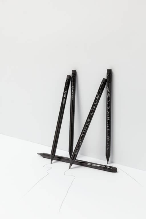 Writing is another important part of Coco Capitán’s artistic practice. Her poetic texts and aphorisms, in her characteristic handwriting and with lots of capitals, spelling mistakes and strike-throughs, are not limited to paper and books but have also appeared – thanks to a wide variety of collaborations, including with the Gucci fashion designer Alessandro Michele – in murals, on clothing, and all sorts of other objects. ‘What are we going to do with all this future?’ and ‘Common sense is not so common’ are just two examples of Capitán’s pithy reflections. ‘When considered in tandem with her writing,’ wrote Businessoffashion.com, ‘her output takes on a more culturally pertinent tone, defined by its oscillation between irony and sincerity, naïvité and knowingness, relativism and truth, optimism and doubt.’ Capitán’s musings are both authentic and culturally relevant, thereby adding a unique layer of meaning to her oeuvre, but also – and more literally – to the products she has decorated in this way. Huis Marseille has developed a pencil and a scarf bearing texts by Coco Capitán.
