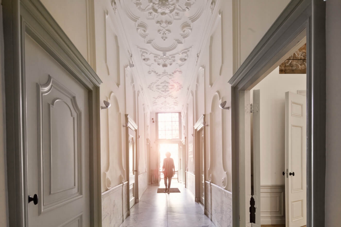 During the early eighteenth century, the interior was embellished considerably. Beautiful stuccowork in the entrance hall still attests to this: appearing on the ceiling across from the courtyard is Mercury, the god of trade, and above the stairway Victoria, the goddess of victory, bringing peace and prosperity.