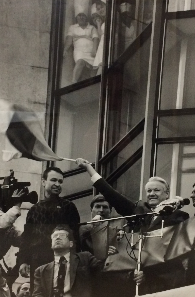 Oleg KlimovThe Russian president Boris Yeltsin is holding the Russian tricolour after the defeat of the first putsch, 1991-2004