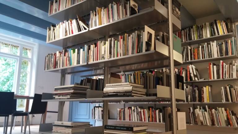 In het display links van de schouw wordt bij elke tentoonstelling een nieuwe selectie boeken uitgelicht die context en verdieping biedt bij het op dat moment in het museum getoonde werk.