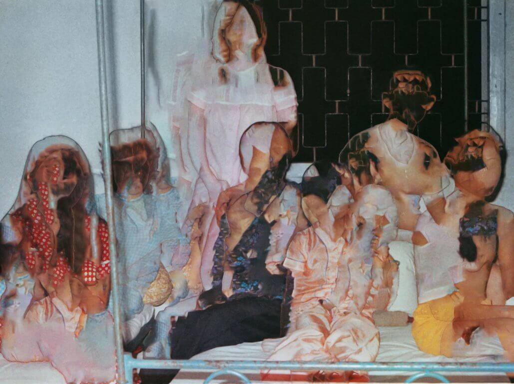De eerste keren dat Hua als volwassene Ho Chi Minhstad in Vietnam bezocht, in 2016 en 2017, voelde ze zich zowel fysiek als mentaal dichter bij haar familiegeschiedenis gebracht. Het was het startschot van de serie Tropism: consequences of a displaced memory (‘Tropisme: consequenties van een ontheemd geheugen’) die als een rode draad door de tentoonstelling loopt. Beelden uit Hua’s familiearchief zijn via een algoritme digitaal bewerkt, zodat de figuren of de omgeving verwateren tot abstracte lijnen en kleuren – zonder ooit helemaal op te lossen. Wat een veranderde werkelijkheid lijkt, is in feite een gesprek met het verleden en een verbeelding van de voortdurende beweging van het geheugen: in de loop van de tijd verdwijnen of veranderen herinneringen. ‘Wat ik mooi vind aan mijn cultuur is dat we het verleden koesteren. Dit uit zich in het obsessief fotograferen van alles, want met vastleggen en herhalen prent je iets in je geheugen. Het geeft de mogelijkheid om je dingen te herinneren [“remembrance”] en weer onderdeel te maken van jezelf [“re-membering”],’ zegt de kunstenaar.